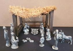 >Vintage 17 pc. Creche Manger, pewter metal figurines, wooden stable w/straw roof